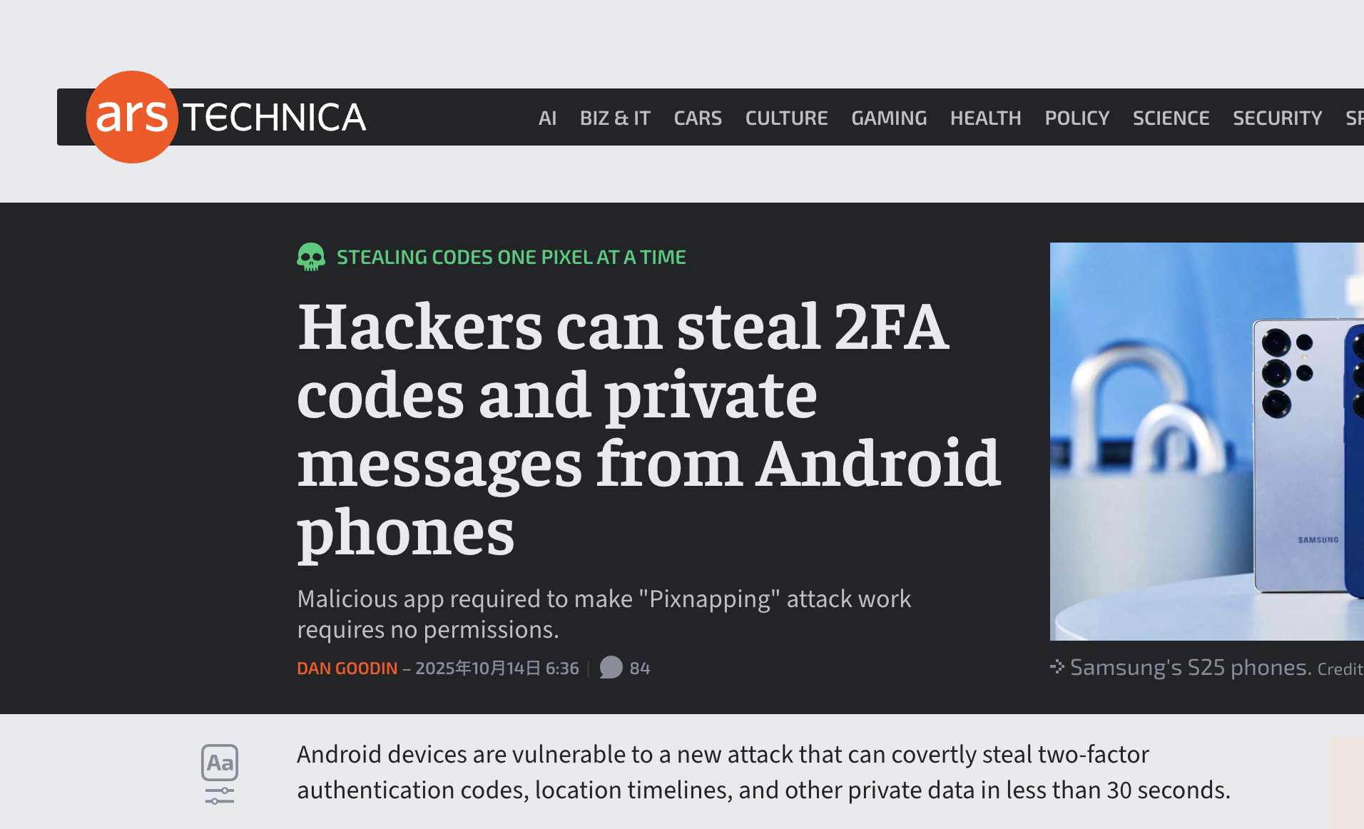 10月14日、Ars Technicaが「Hackers can steal 2FA codes and private messages from Android phones」と題した記事を公開した。この記事では、Android端末の画面に描画された情報を「Pixnapping」と呼ばれる新手法で盗み見し、2要素認証(2FA)コードやチャット、位置履歴などを数十秒で窃取できる脅威について詳しく紹介されている。