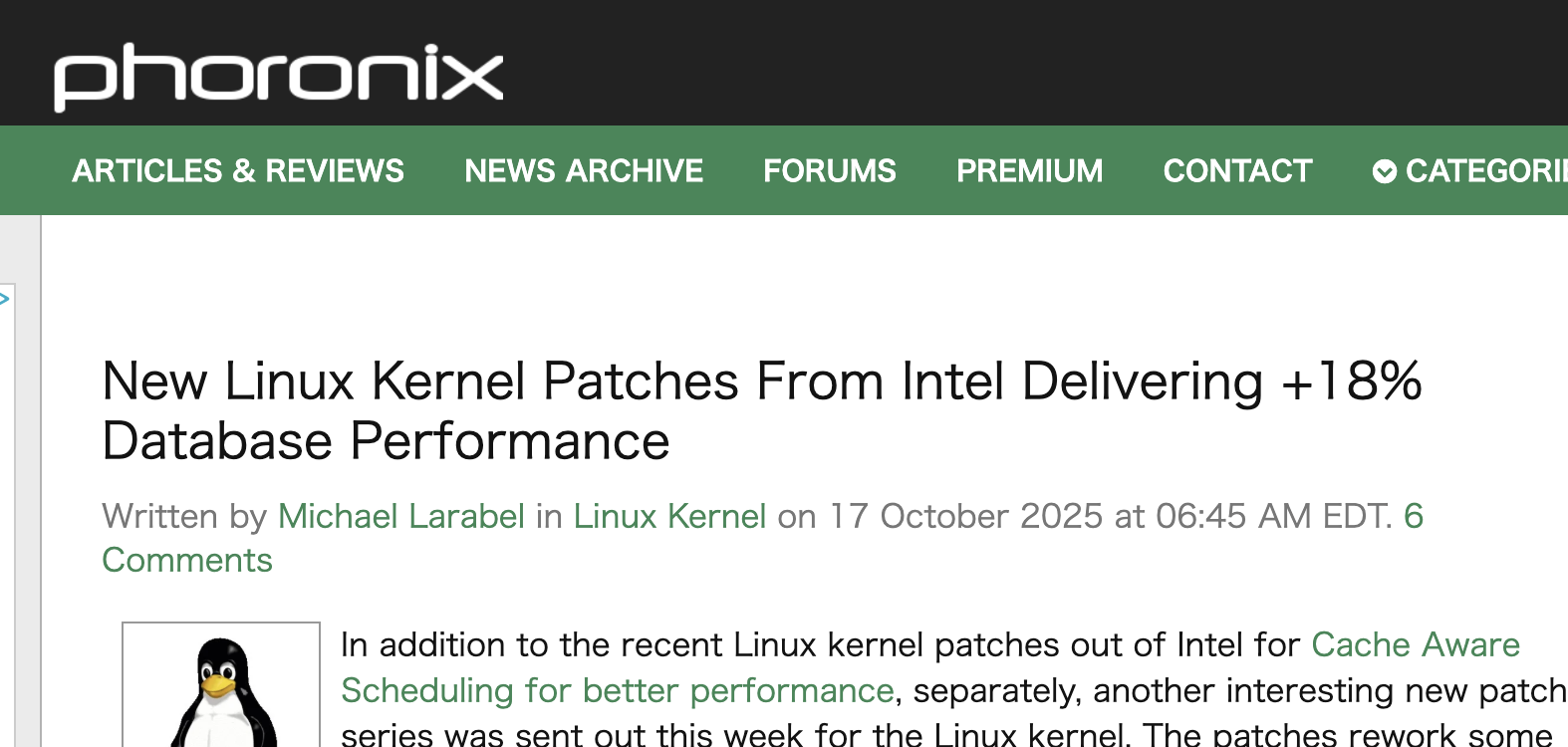 10月18日、海外のテクノロジーメディアPhoronixが「New Linux Kernel Patches From Intel Delivering +18% Database Performance」と題した記事を公開した。この記事では、Intelによる新しいLinuxカーネルパッチがデータベース性能を最大18%向上させる可能性について詳しく紹介されている。