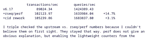 ベンチマークを用いたPostgreSQLのテストで最大14%の性能向上が確認された。また、別のブランチのコードではさらに3%の追加改善が見込まれているという。