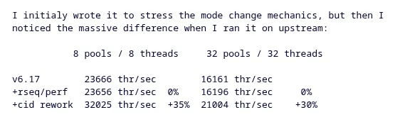 さらに、スレッドの作成と破棄を繰り返す「thread-create teardown」マイクロベンチマークでは、従来の上流版Linuxカーネルに比べて最大30%もの改善が見られた。