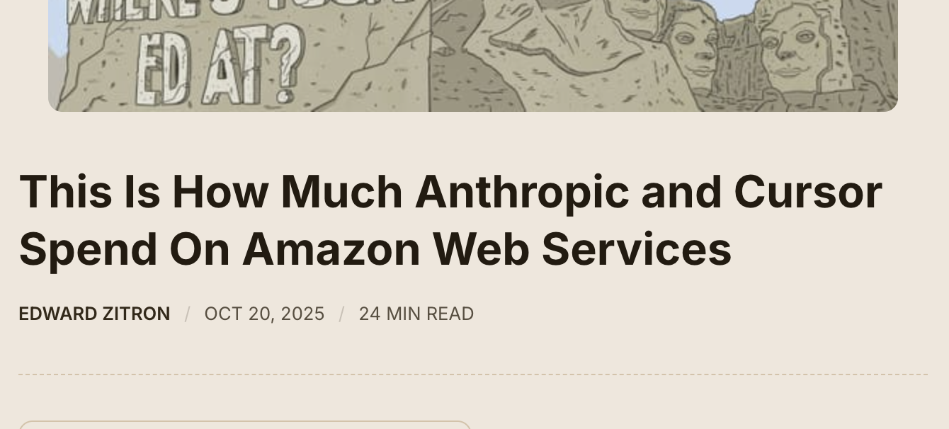 10月21日、Ed Zitron氏が「This Is How Much Anthropic and Cursor Spend On Amazon Web Services」と題したブログ記事を公開し、話題を呼んでいる。この記事では、AnthropicとAIコーディングツールCursorのAWS支出実態と、その収益性や価格戦略への影響について詳しく紹介されている。以下に、その内容を紹介する。