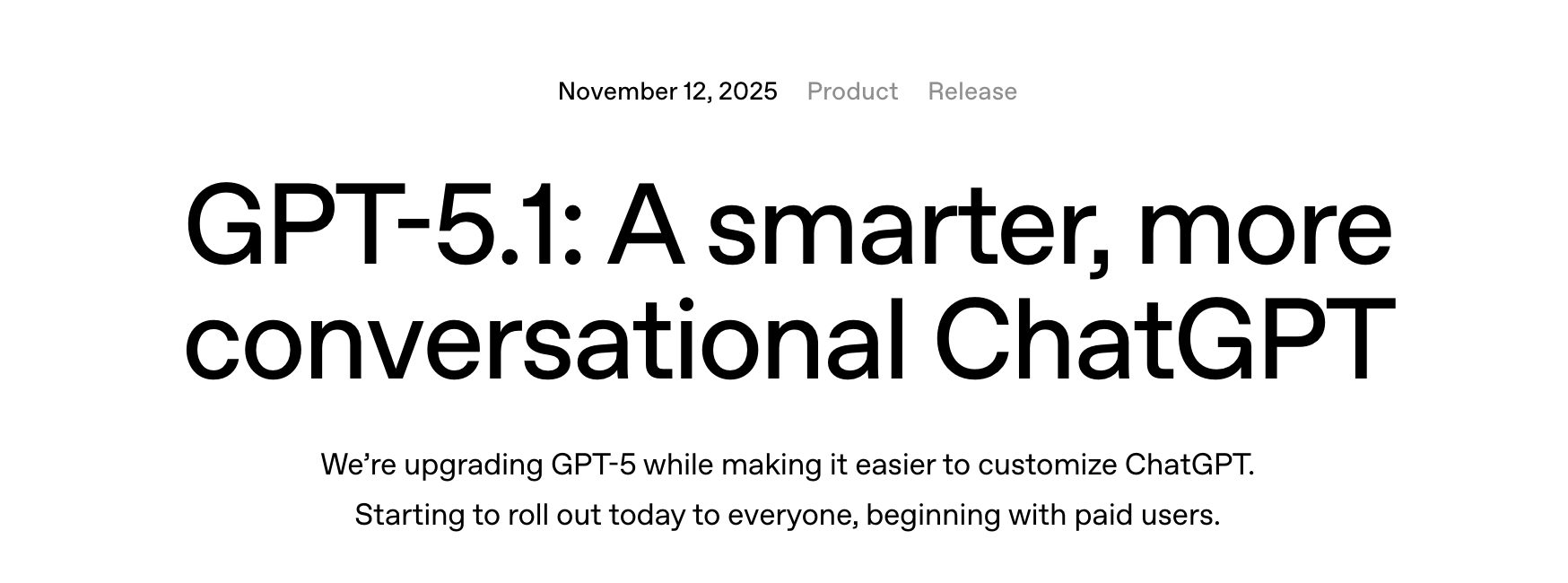 11月13日、OpenAIが「GPT-5.1: A smarter, more conversational ChatGPT」を公開した。