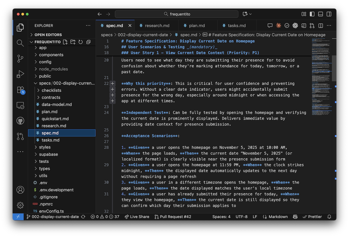 仕様は多くの場合、複数のMarkdownファイルとして生成される。GitHubのspec-kitを用いた例では、小さな機能追加でも8ファイル・約1,300行のテキストになったという。