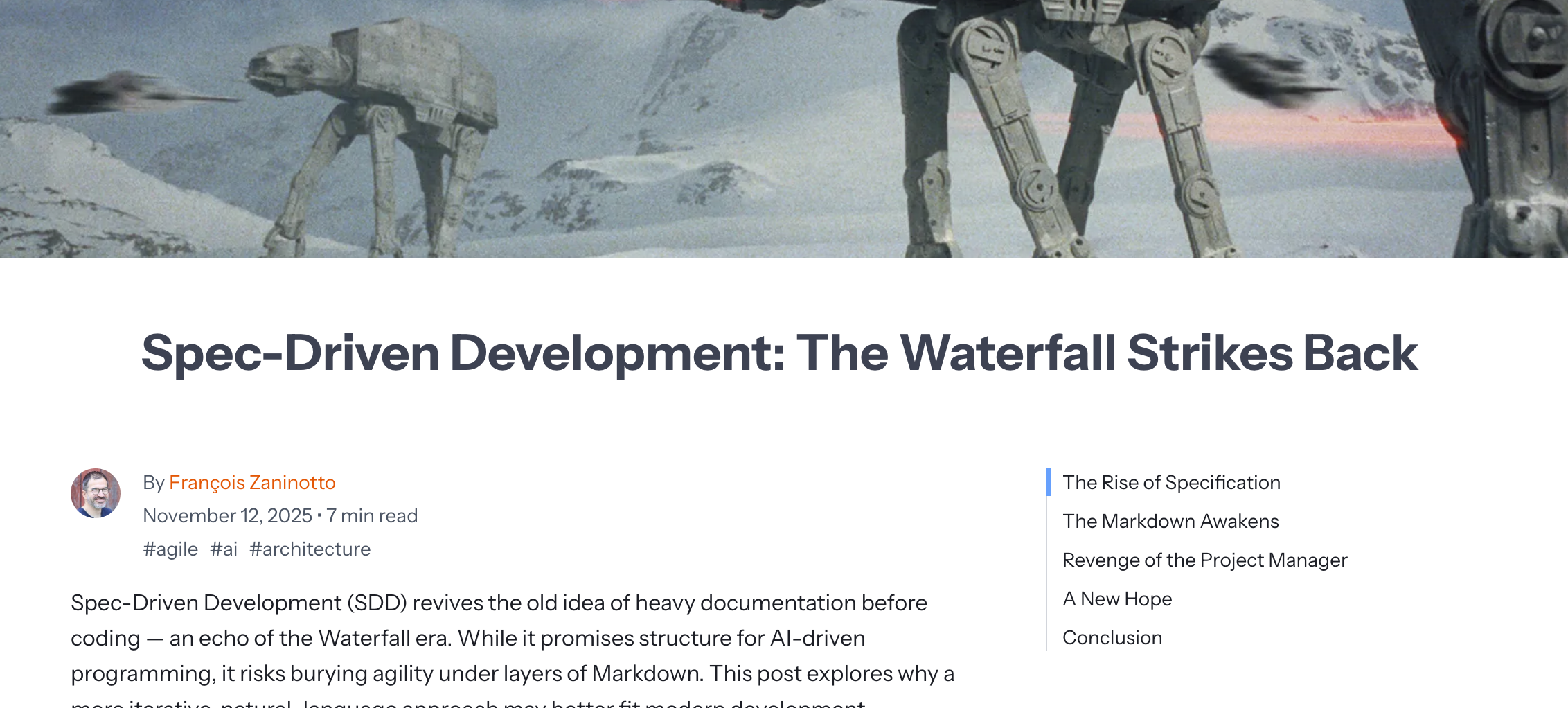11月16日、「Spec-Driven Development: The Waterfall Strikes Back」と題したブログ記事が公開され、海外で話題を呼んでいる。この記事では、仕様書駆動開発(Spec-Driven Development; SDD)がAI時代のプログラミングに秩序をもたらすという期待と、冗長な文書作成がアジリティを損なうという懸念の両面について詳しく紹介されている。以下に、その内容を紹介する。