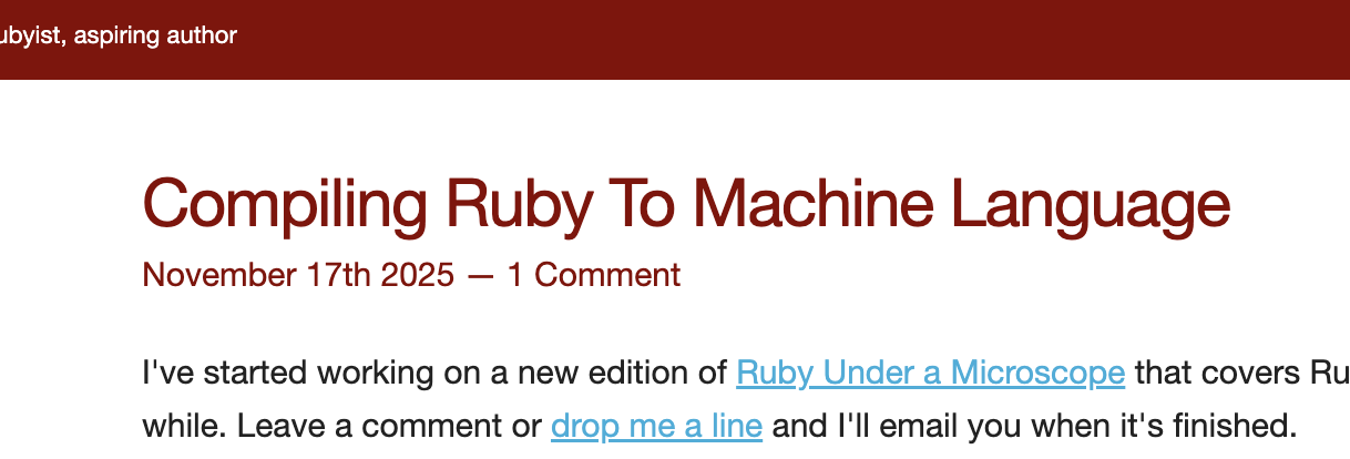 11月18日、Pat Shaughnessy氏が「[Compiling Ruby To Machine Language]([https://patshaughnessy.net/2025/11/17/compiling-ruby-to-machine-language)」と題した記事を公開し、話題となっている。この記事では、Ruby 3系で導入・発展しているJITコンパイラ YJIT と ZJIT が、Rubyコードをどのように機械語へとコンパイルし、高速に実行しているのかについて詳しく紹介されている。
