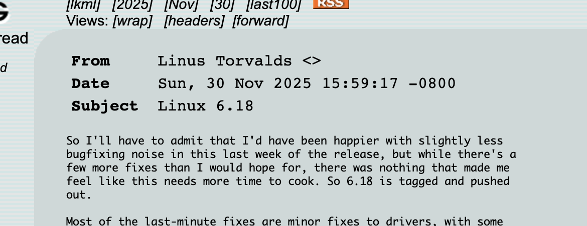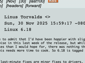 Linux 6.18公開後、6.19のマージウィンドウが開かれ、初のリリース候補(RC1)は12月14日に公開予定である。6.18は年内最後のカーネルであるため、Greg Kroah-Hartman氏がLTS採用を判断すれば、数年にわたって長期サポートが提供される可能性が高い。