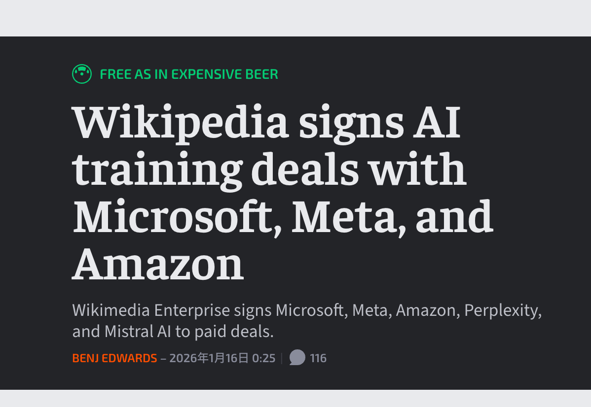 1月16日、Ars Technicaが「Wikipedia will share content with AI firms in new licensing deals」と題した記事を公開した。この記事では、ウィキメディア財団が大手AI企業各社と締結した、Wikipediaコンテンツの利用に関する新たなライセンス契約について詳しく紹介されている。以下に、その内容を紹介する。ウィキメディア財団は1月15日(現地時間)、Microsoft、Meta、Amazon、Perplexity、およびMistral AIの5社とライセンス契約を締結したことを発表した。この提携により、Microsoft CopilotやChatGPTなどのAIアシスタントを支える大規模言語モデル(LLM)のトレーニングにおいて、Wikipediaのコンテンツを商用利用するための枠組みが拡大されることとなる。これまで、これらの企業の多くは許可を得ることなくWikipediaのデータをスクレイピング(自動収集)して利用してきた経緯がある。しかし、今回の契約締結により、主要なAI開発企業の多くが「Wikimedia En...