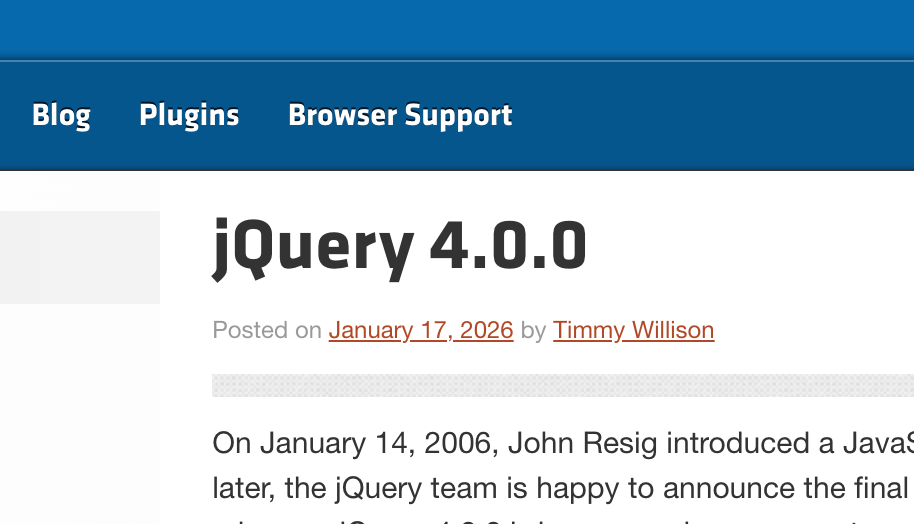 1月19日、jQueryチームが「jQuery 4.0.0」と題した記事を公開した。この記事では、約10年ぶりのメジャーアップデートとなる最新版の変更点とともに、Webの7割以上を支え続けるこのライブラリの現在地について詳しく紹介されている。