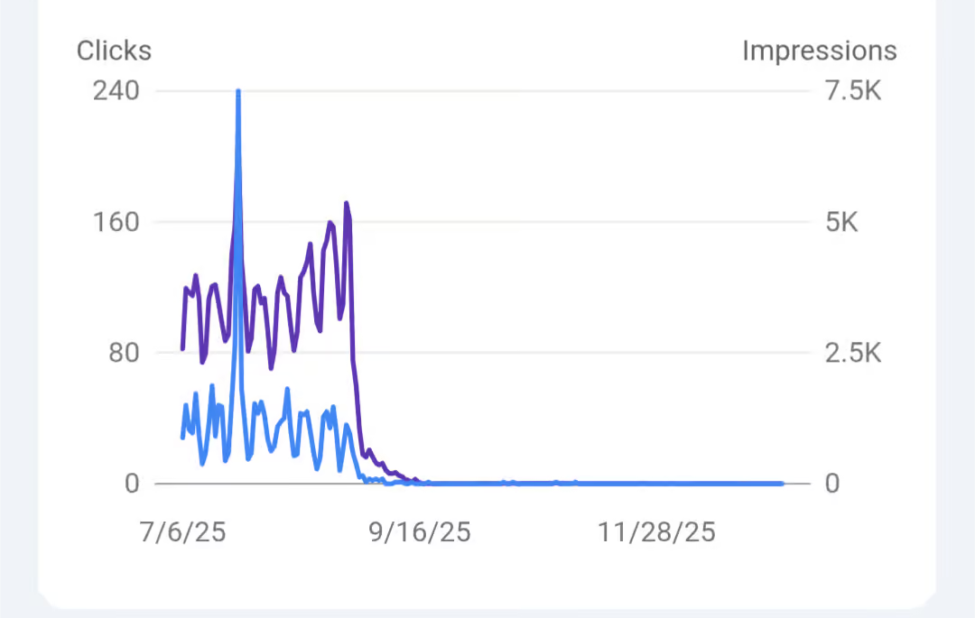 エンジニアのAdam Coster氏は、自身のウェブサイトのトラフィックに異常な問題が発生していることに気づき、その状況をDiscord上で公開した。Googleからの流入を示すグラフ(下図)を確認すると、2025年8月中旬を境にクリック数とインプレッション数が突如としてゼロに転じていることがわかる。
