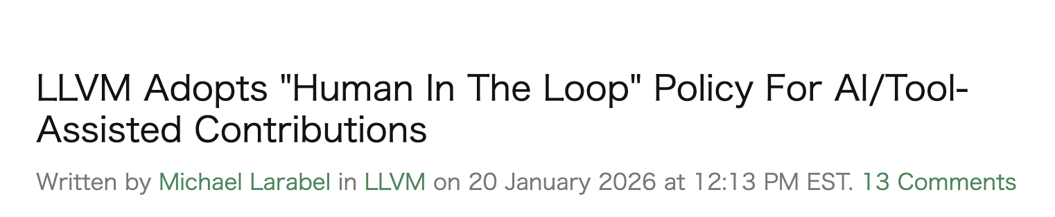 詳細はLLVM Adopts "Human In The Loop" Policy For AI/Tool-Assisted Contributionsを参照していただきたい。