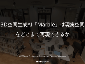 こんにちは。MESONの高村です。 2025年11月、World Labs社が3D世界生成サービス「Marble」を一般公開しました。 今回はこのMarbleで利用できる複数の手法を使って、MESONオフィスを対象に現実空間の3DGS(3D Gaussian Splatting)化を試みたので、その検証結果をお伝えします。 Marbleとは MarbleはWorld Labs社が2025年11月にリリースした、3DGS生成サービスです。テキスト・画像・パノラマ・動画から、探索可能な3D空間を生成できます。 入力形式 テキストプロンプト 単一画像 / 複数画像(4方