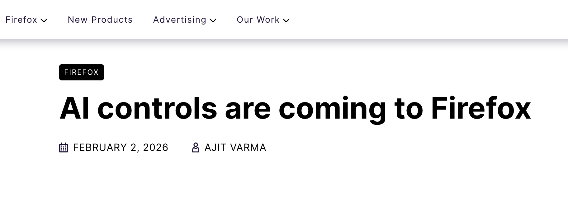 2月3日、Mozillaが「AI controls is coming to Firefox」と題した記事を公開した。この記事では、Firefox 148にて実装される、ブラウザ内の生成AI機能を一元的に管理・遮断するための新機能について詳しく紹介されている。