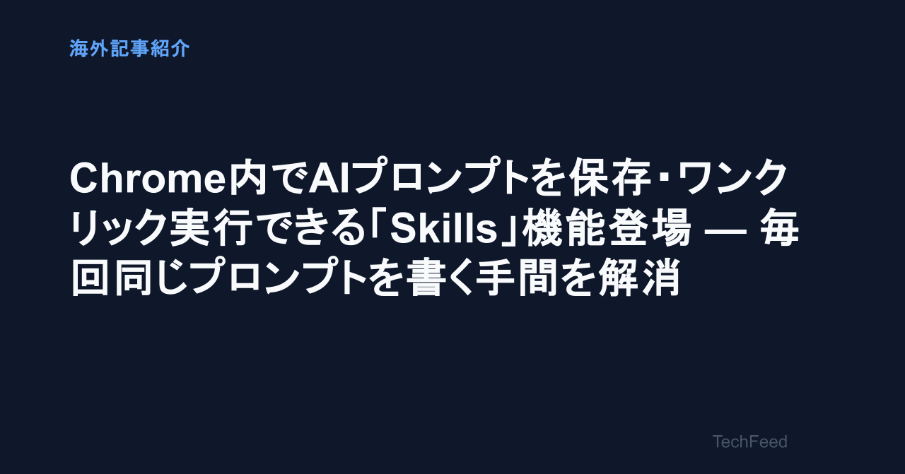 Googleが発表した新機能「Skills」は、この課題を根本的に解決する。Chrome内でAIプロンプトを保存し、ワンクリックで任意のページに適用できるようになった。プロンプトエンジニアリングが一般化する中で、優秀なプロンプトを資産として蓄積・再利用できる仕組みの登場は大きな意味を持つ。