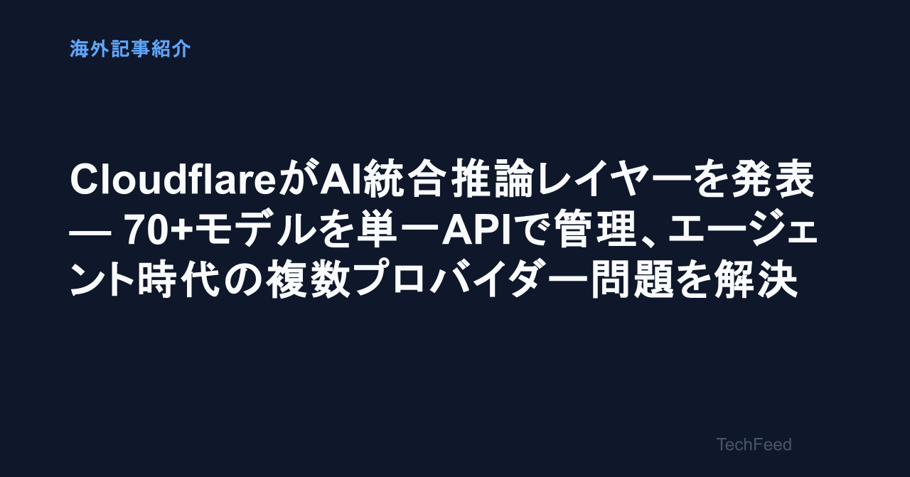 Cloudflareの新機能では、12以上のプロバイダーから70以上のモデルに単一APIでアクセスできる。既存のAI.run()バインディングを使って、OpenAI、Anthropic、Google、Alibaba Cloudなどのサードパーティモデルを呼び出せ、プロバイダー間の切り替えは1行のコード変更で完了する。