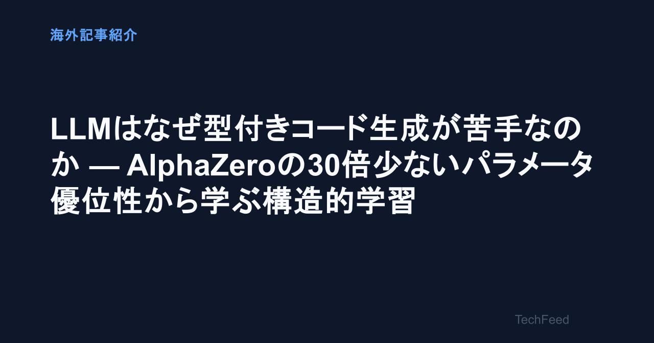 GPT-4は1.8兆のパラメータを持つ巨大モデルだが、チェスでは中級者レベル(1371 ELO)にとどまる。一方、わずか6000万パラメータのAlphaZeroは超人的な強さ(3400+ ELO)を誇る。この30倍の性能差の秘密は構造を学習プロセスに組み込むかどうかにある。同じ問題が、現在のLLMによる型付きコード生成でも起きているというのだ。